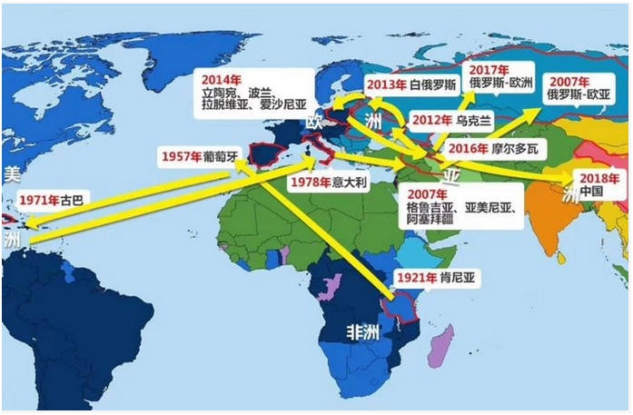 1921年东非国家肯尼亚首次确认非洲猪瘟疫情。1957年传入欧洲,1971年传入美洲,2007年首次传播至欧亚接壤的格鲁吉亚,迅速传入俄罗斯,并在高加索地区定殖。2012年传入乌克兰,2013年传入白俄罗斯。2017年向东长距离跨越式传播至俄罗斯远东地区伊尔库茨克,2018年8月传入我国辽宁。