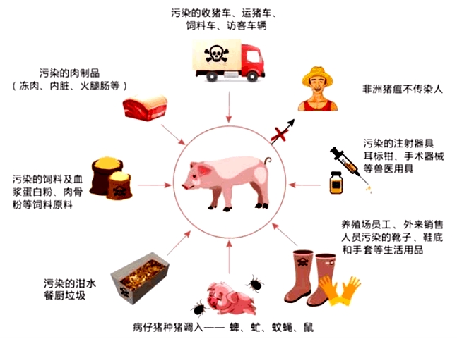 非洲猪瘟病毒主要经消化道、呼吸道和血液等感染猪只,并通过猪只直接接触、物品间接接触和媒介传播等方式传播。