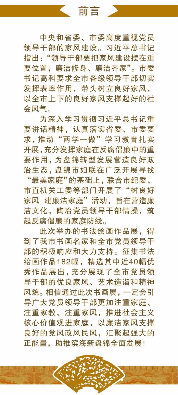 此次举办的书法绘画作品展,得到了我市书画名家和全市党员领导干部的积极响应和大力支持,征集书法绘画作品182幅,精选其中近40幅优秀作品展出,充分展现了全市党员领导干部的优良家风、艺术造诣和精神风貌。相信通过此次书画展,一定会引导广大党员领导干部更加注重家庭、注重家教、注重家风,推进社会主义核心价值观进家庭,以廉洁家风支撑良好的党风政风民风,汇聚起强大的正能量,助推滨海新盘锦全面发展!